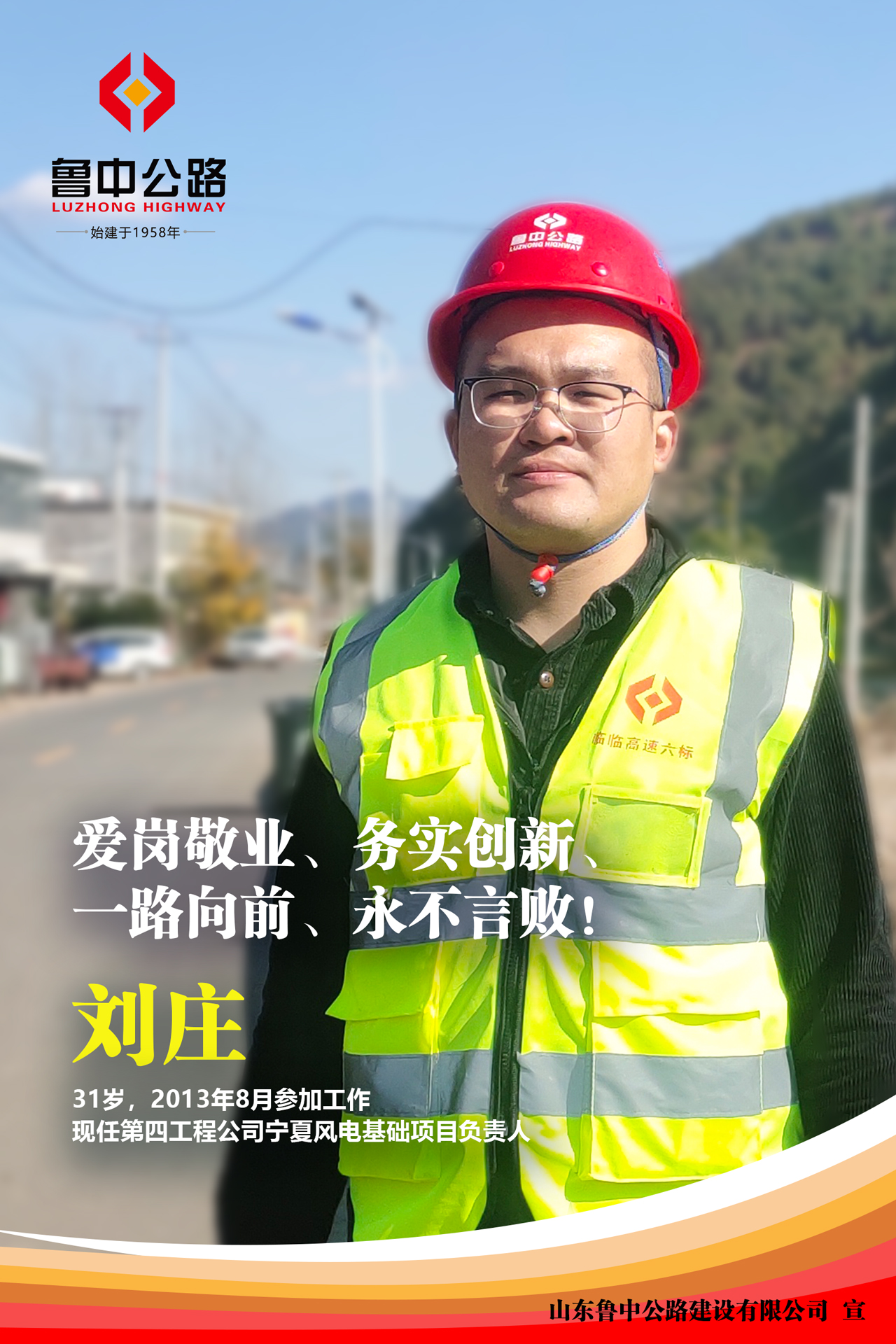 劉莊自參加工作以來一直駐守施工現(xiàn)場一線,從事現(xiàn)場施工工作。先后參加了長雙高速、沂源危橋改造、S102張博路分離立交、南崔路分離立交、寧夏風(fēng)電等項目的建設(shè),現(xiàn)任寧夏風(fēng)電項目負(fù)責(zé)人。他的勤奮好學(xué)、踏實肯干,在工作上精益求精,有較高的理論水平和極強的學(xué)習(xí)能力,一直是公司的技術(shù)骨干。從青澀的學(xué)生到項目總工再到項目負(fù)責(zé)人的完美蛻變,歷經(jīng)八年,讓我們從他身上看到了閃光而集聚的正能量。