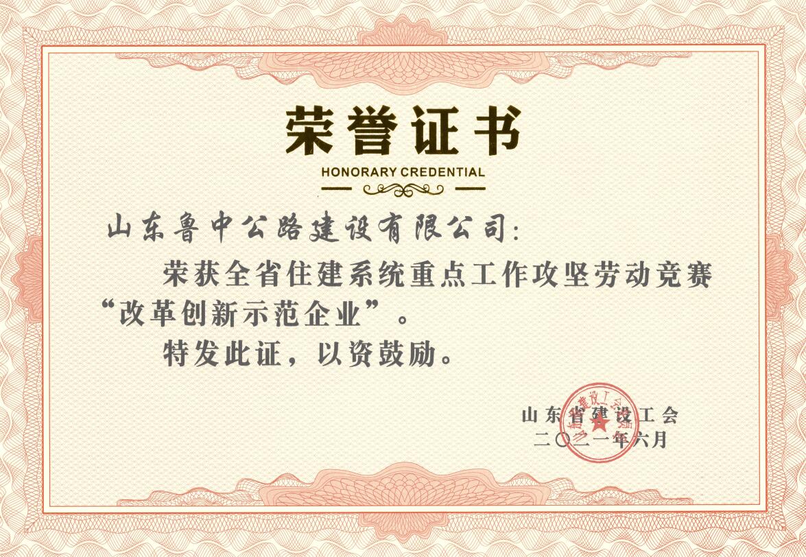 近日,公司領(lǐng)取到山東省建設(shè)工會頒發(fā)的全省住建系統(tǒng)重點(diǎn)工作攻堅勞動競賽“改革創(chuàng)新示范企業(yè)”榮譽(yù)證書。
