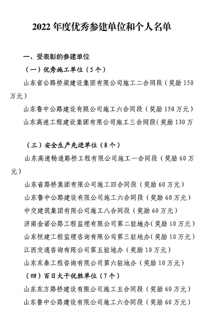 表彰內(nèi)容:臨臨項目六合同獲“優(yōu)秀施工單位”獎勵150萬元、“安全生產(chǎn)先進單位”獎勵60萬元、“百日大干優(yōu)勝單位”獎勵60萬元。項目部李樹王等11名員工分獲優(yōu)秀工程師、安全生產(chǎn)先進個人、征拆工作先進個人、農(nóng)民工工資管理先進個人、安保維穩(wěn)先進個人稱號。
