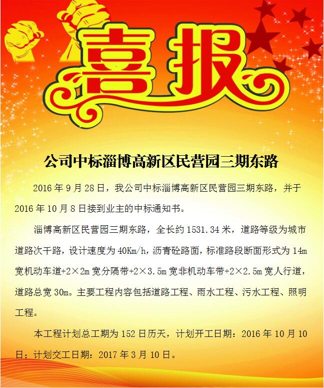 公司中標淄博經(jīng)濟開發(fā)區(qū)柳園路道路建設工程