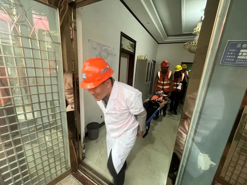 醫(yī)療救護組將傷者抬出火災現(xiàn)場并對傷者進行緊急救治送醫(yī)
